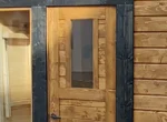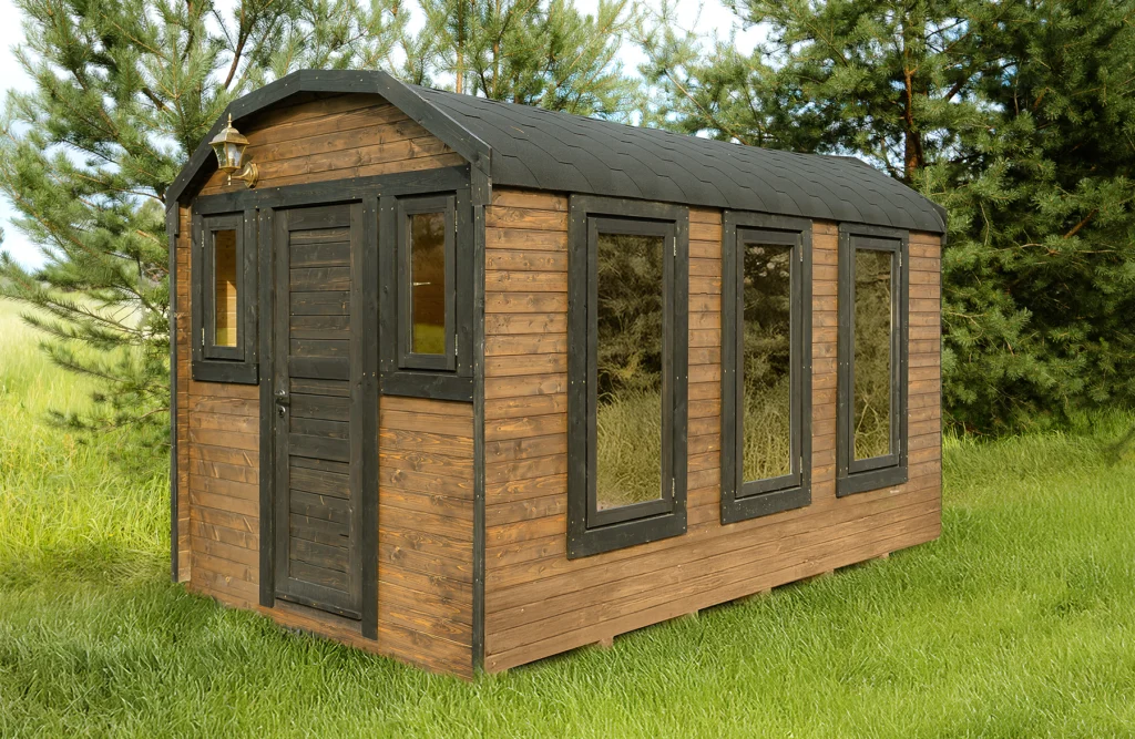 Wooden Makoya Spa tiny house with entrance door, several windows and a dark gable roof